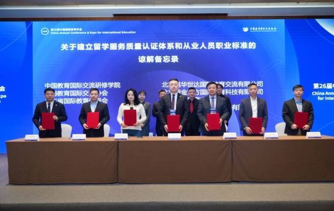 作为本次论坛的重要成果,由中国教育国际交流协会出国留学服务分会牵头,中国教育国际交流研修学院与广东省国际教育促进会、上海教育国际交流协会、北京嘉华世达国际教育交流有限公司、北京留金东方国际教育科技有限公司、中教国际教育交流中心、金吉列出国留学服务咨询公司共同签署《关于建立留学服务质量认证体系和从业人员职业标准的谅解备忘录》。